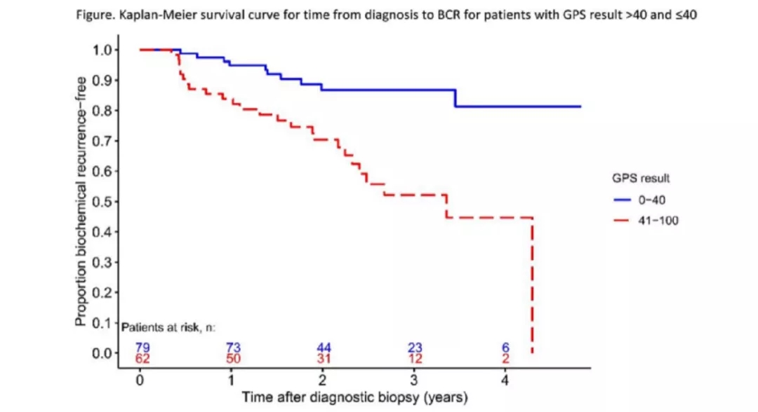 方法:本项回顾性队列研究,纳入2014至2019年期间美国北岸大学卫生系统所有接受RP、有可用活检组织的NCCN中高危前列腺癌患者。活检组织用于GPS分析。BCR定义为≥0.2 ng/ml,或在RP后连续两次PSA升高后启动挽救性放疗或内分泌治疗。使用单变量Cox比例风险模型评估GPS结果(每增加20个单位,或0~40 vs. 41~100)与至BCR时间的相关性。