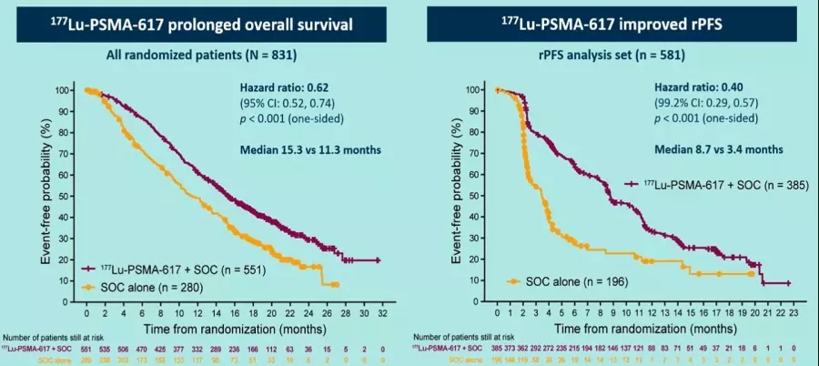研究设计:VISION研究是一项国际多中心、随机、开放的Ⅲ期临床研究,共纳入831例既往接受化疗和雄激素受体靶向疗法治疗后疾病进展且PSMA-PET/CT结果阳性的mCRPC患者,按照2:1的比例分为177Lu-PSMA-617联合标准治疗(SOC)组(n=551)和单独SOC组(n=280),对比二者的有效性和安全性。主要终点为影像学PFS(rPFS)和OS,次要终点包括ORR、DCR、安全性和QoL等。