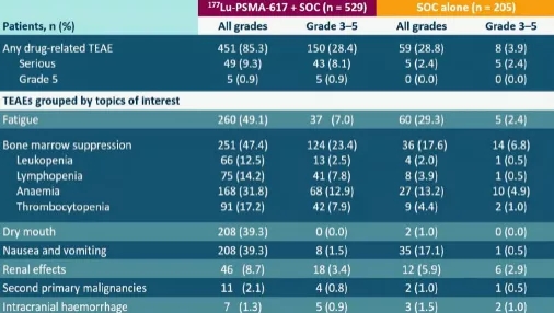 安全性方面,药物相关的治疗期间出现的不良事件(TEAE)177Lu-PSMA-617+SOC组发生率为85.3%,SOC组为28.8%,严重药物相关的TEAE两组发生率分别为9.3%和8.1%。其他特别关注的TEAE,如疲劳、骨髓抑制、第二肿瘤等的发生率详表2。