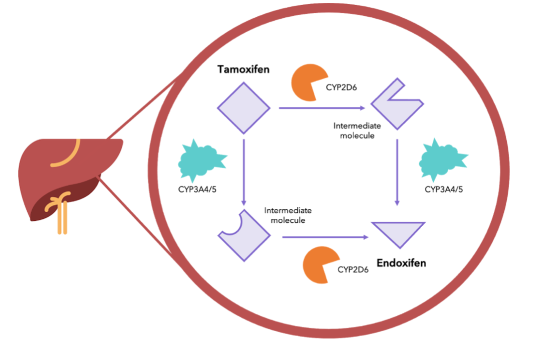 近年来,药物代谢组学研究发现,TAM主要通过CYP3A4/5、CYP2D6等限速酶作用,转化为具有活性的代谢产物Endoxifen(如下图)。不同的限速酶表型,可能对TAM的疗效和不良反应存在差异。