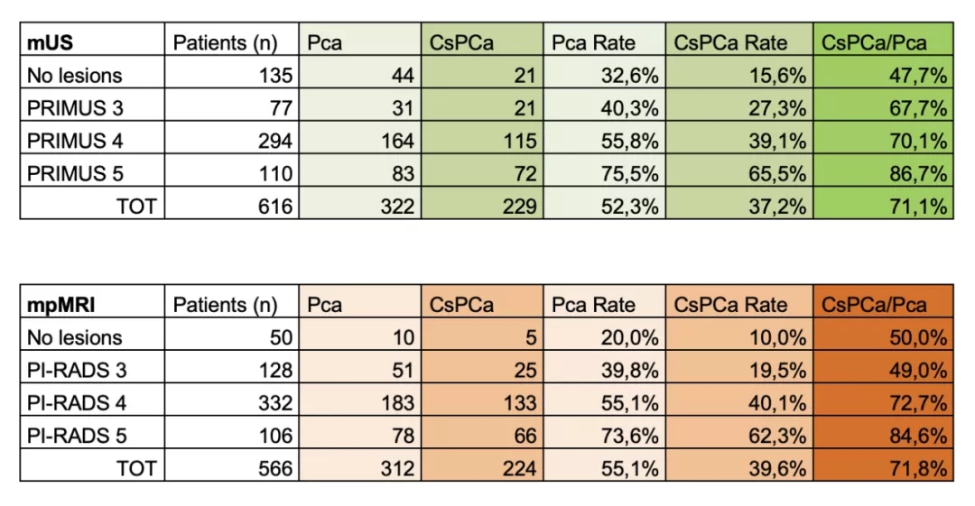 方法:前瞻性纳入了616例临床怀疑PCa且有可用MRI数据的患者。使用PRI-MUS方案确定mUS上的靶病灶。mUS扫描完成后泌尿医生才获知MRI结果。所有受试者接受靶向活检(基于mUS和MRI)和系统活检。根据活检结果对csPCa检出率进行评估和分层。