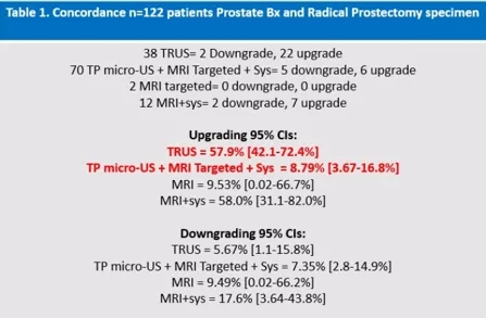 方法:对2018年2月至2020年11月间在西班牙马德里的单中心接受机器人RP的122例患者的标本进行分析。70例患者的术前活检采用mUS+mpMRI靶向+系统活检的经会阴前列腺穿刺活检(TP),38例为传统经直肠超声活检(TRUS),12例为MRI靶向+系统活检,2例为单纯MRI靶向活检。评估指标包括病理升级和降级、Gleason评分和分级,活检与机器人RP标本之间的ISUP一致性。统计分析采用方差分析。