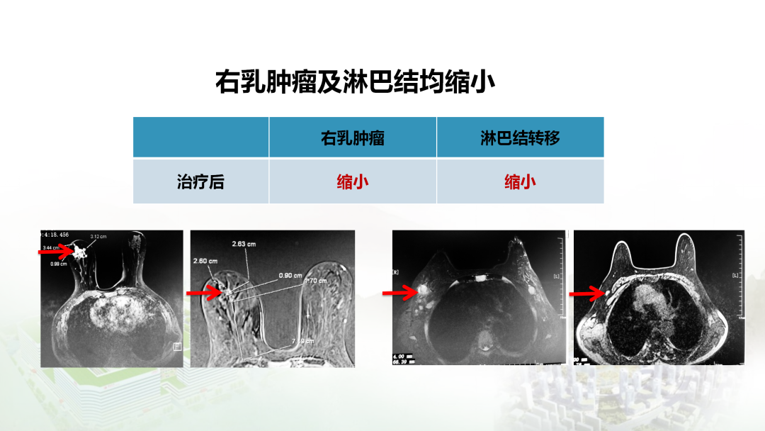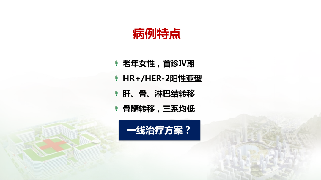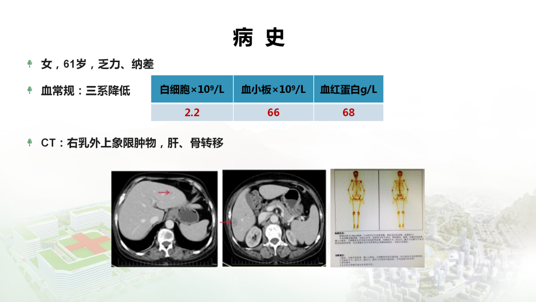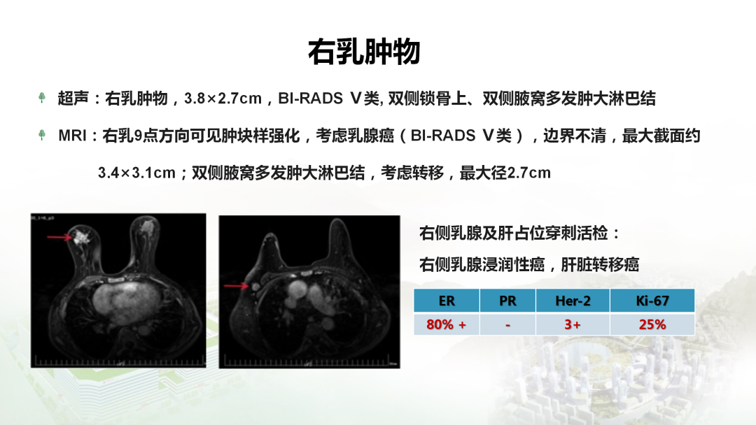 61岁女性,以乏力、纳差为首要表现,血常规提示白细胞、血小板、血红蛋白三系均降低。CT检查提示右乳外上象限肿物,肝、骨转移。超声显示右乳肿物3.8×2.7cm,BI-RADS Ⅴ类, 双侧锁骨上、双侧腋窝多发肿大淋巴结。乳腺MRI显示右乳9点方向肿块,大小3.4×3.1cm, BI-RADS Ⅴ类;双侧腋窝多发肿大淋巴结,最大径2.7cm。右乳肿物及肝占位穿刺活检显示右侧乳腺浸润性癌,肝脏转移癌,免疫组化表现为ER(80%+)、PR(-)、HER2(3+)、Ki-67(25%)。骨髓穿刺活检可见弥漫异型细胞,考虑骨髓转移。