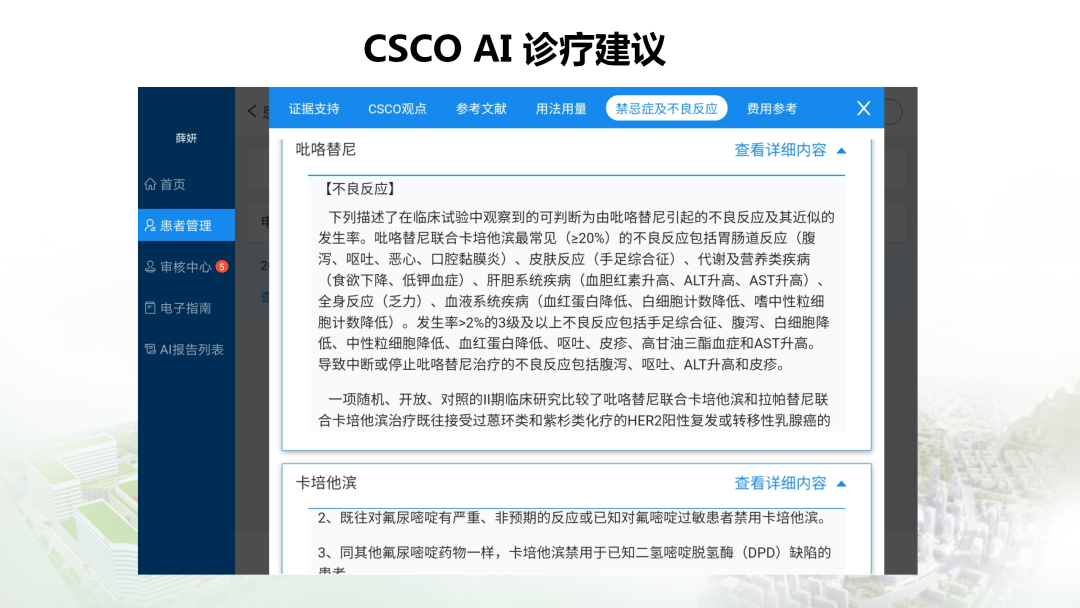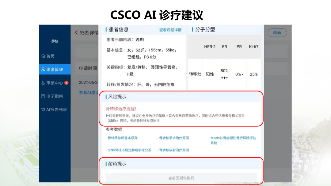 CSCO AI对管理患者提供了极大的帮助。第一,医生书写的病历是否完整、诊疗思路是否正确在这个数据库中一目了然,有利于指导下级医生、管理患者,提高医疗质量。第二,医生可以使用CSCO AI系统提供的乳腺癌治疗科普和不良反应管理视频,提供便利的患者教育。第三,CSCO AI也是个很好的医患沟通平台,让患者的困惑可以及时得到医生的解答,增加医患沟通,助力肿瘤治疗。