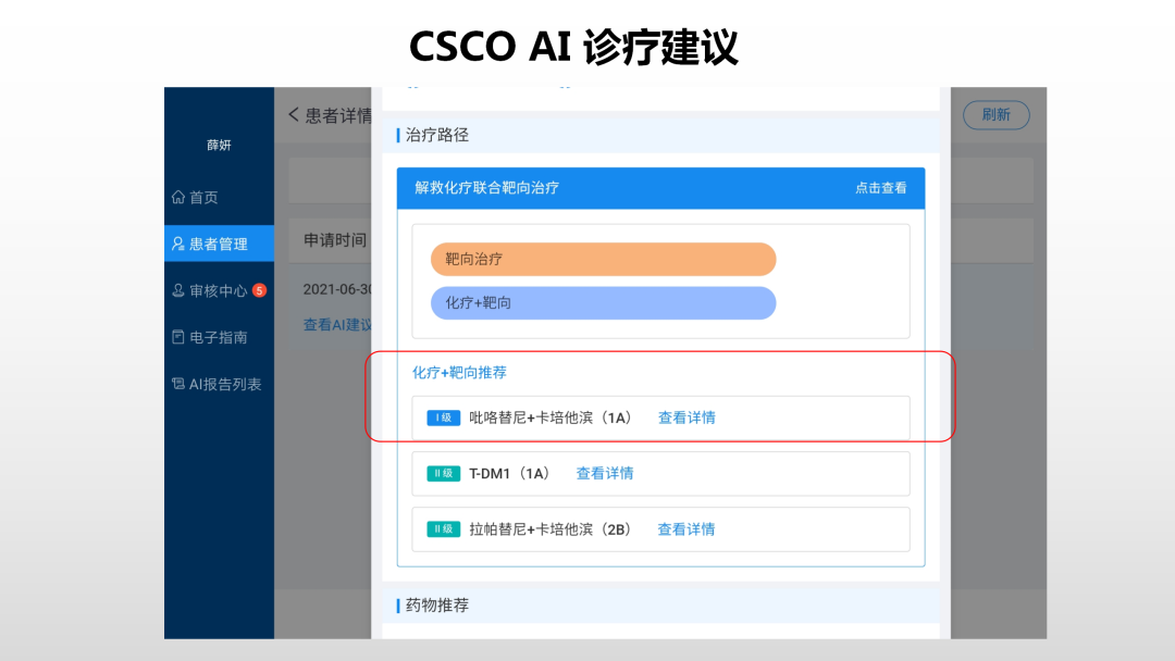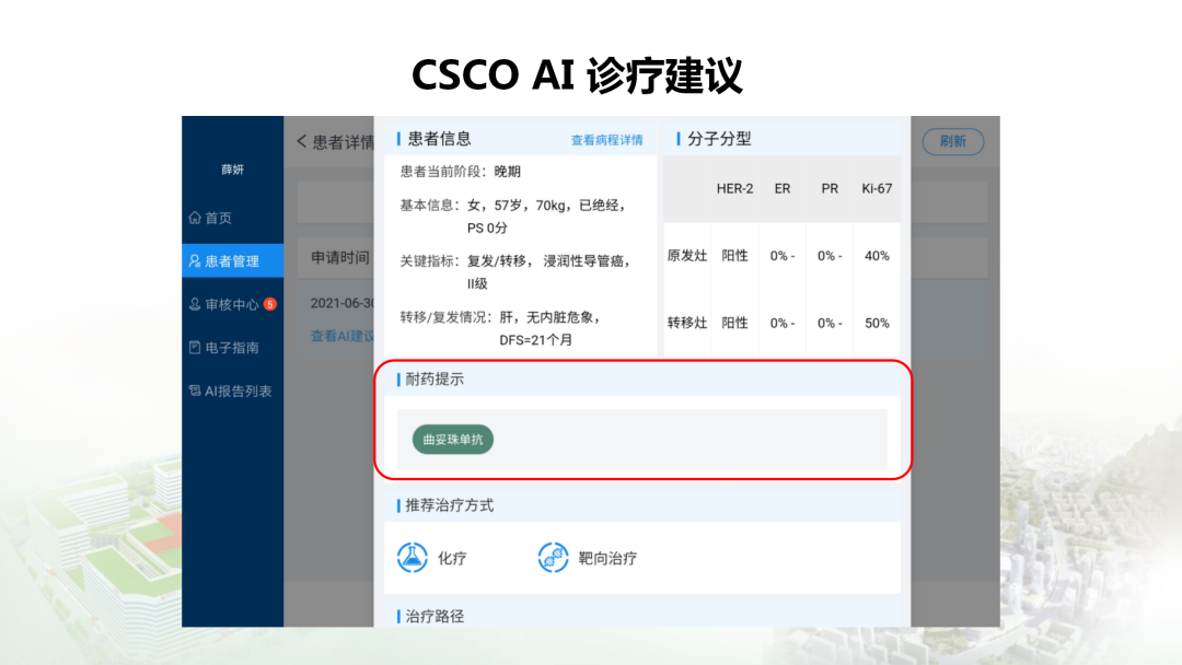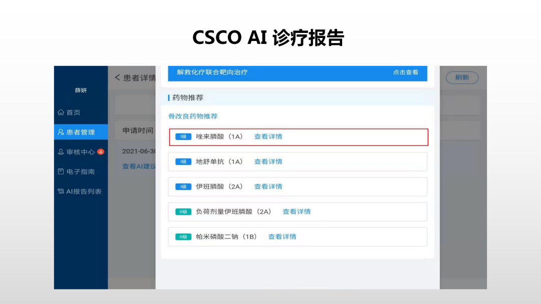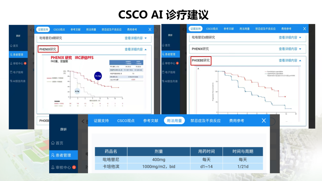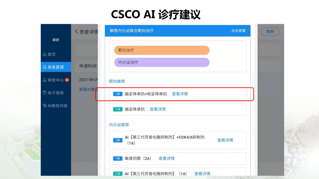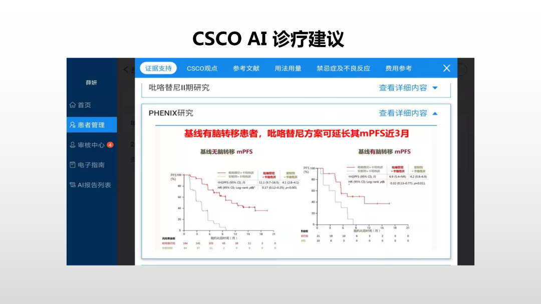 除了管理患者, CSCO AI也为医生再教育提供了快捷便利的途径。年轻医生和基层医生可以在操作CSCO AI的过程中学习到很多文献、专家观点及指南建议。希望CSCO AI能够纳入更多的国际前沿进展,与国内诊疗建议并行推荐,在对比中让基层医生、年轻医生更快成长。