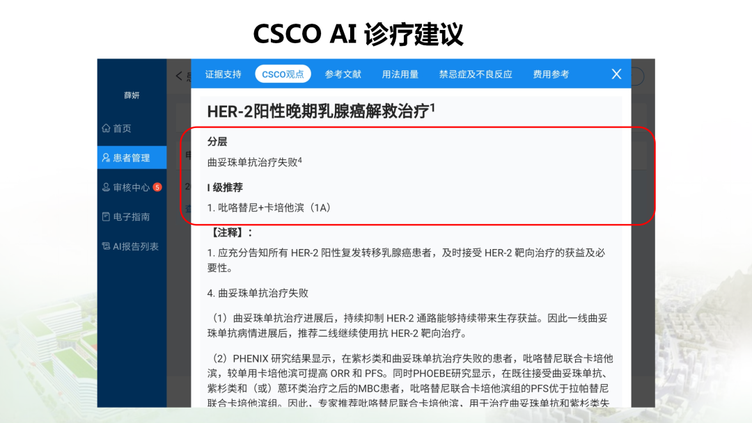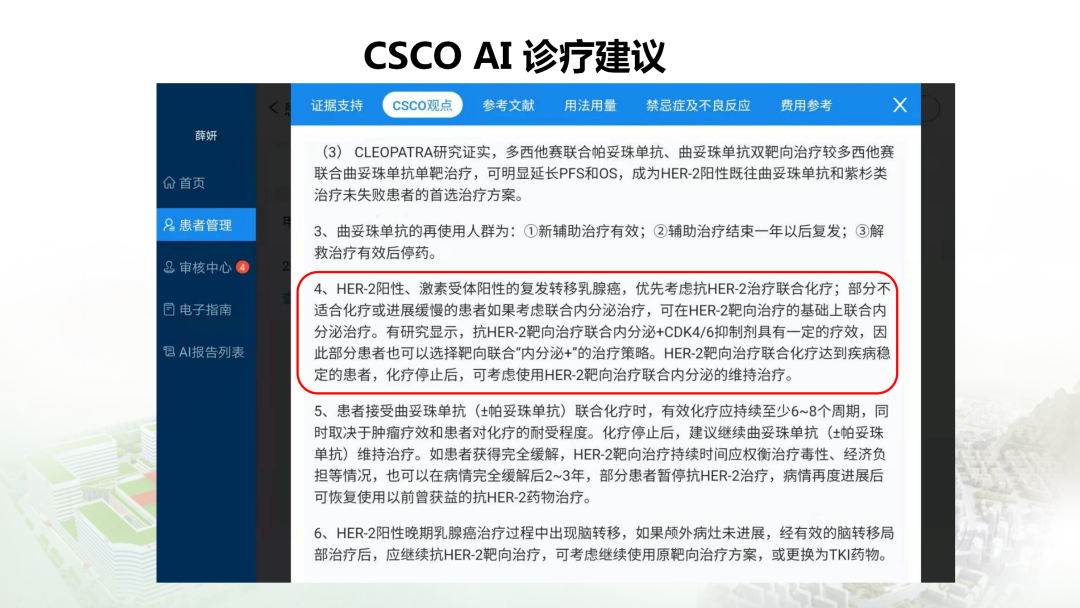 薛妍教授:对于原发曲妥珠单抗耐药的晚期HER2阳性乳腺癌,CSCO AI根据循证医学证据给出了精确指导。后期该领域可以引入更多新的数据,比如HER2CLIMB模式——在曲妥珠单抗治疗进展后保留曲妥珠单抗并加入TKI,该模式已经被NCCN指南纳入,但在中国尚无推荐。因此,我认为CSCO AI可以超前一些,当然江泽飞教授也指出过度超前可能会导致滥用药,因此超前尺度较难把握,需要继续摸索。