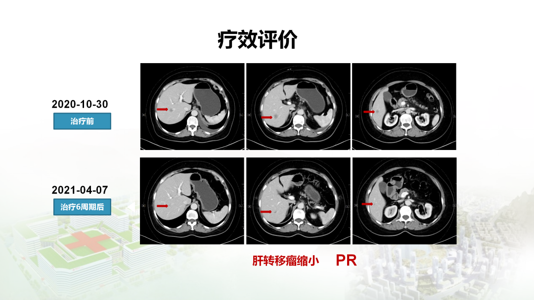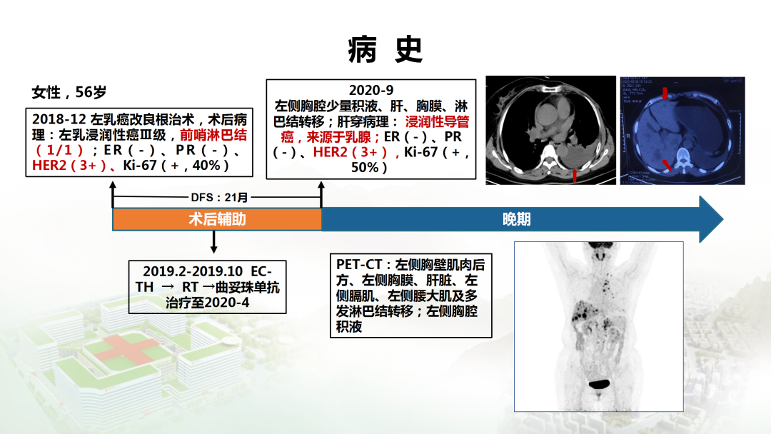 56岁女性,已绝经。2018年12月行左乳癌改良根治术,术后病理提示左乳浸润性癌Ⅲ级,前哨淋巴结(1/1);ER(-)、PR(-)、HER2(3+)、Ki-67(+,40%)。2019年2月至10月使用EC-TH方案,继以放疗,曲妥珠单抗辅助治疗1年,至2020年4月。2020年9月发现肝、胸膜、淋巴结转移,肝转移灶穿刺病理提示浸润性导管癌,来源于乳腺;ER(-)、PR(-)、HER2(3+),Ki-67(+,50%)。PET-CT提示左侧胸壁肌肉后方、左侧胸膜、肝脏、左侧膈肌、左侧腰大肌及多发淋巴结转移,左侧胸腔积液。