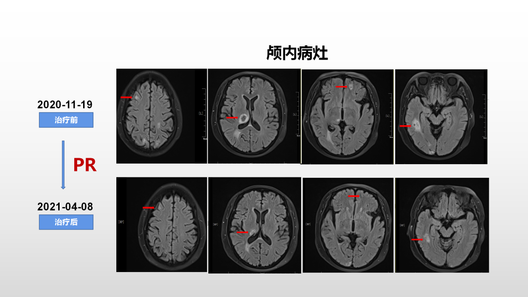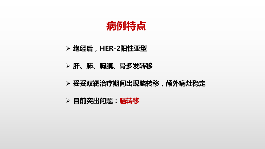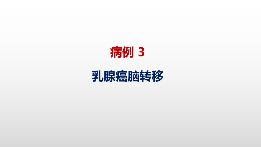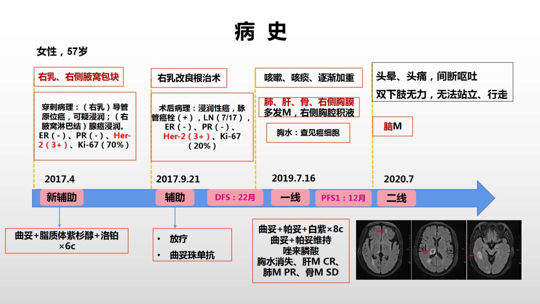 57岁女性,已绝经。2017年发现右乳、右侧腋窝包块,穿刺病理诊断为右乳导管原位癌,可疑浸润;右腋窝淋巴结腺癌浸润。免疫组化ER(-)、PR(-)、Her-2(3+)、Ki-67(70%)。接受曲妥珠单抗+脂质体紫杉醇+洛铂6周期新辅助治疗后行右乳癌改良根治术,术后病理为浸润性癌,脉管癌栓(+),LN(7/17), ER(-)、PR(-)、 Her-2(3+)、Ki-67(20%)。术后行放疗、曲妥珠单抗辅助治疗。22个月后患者出现肺、肝、骨、右侧胸膜多发转移,右侧胸腔积液,胸水查见癌细胞。2019年7月一线选择曲妥珠单抗+帕妥珠单抗+白蛋白紫杉醇治疗8周期,其后使用曲妥珠单抗+帕妥珠单抗+唑来膦酸维持治疗,胸水消失,肝转移灶完全缓解,肺转移灶部分缓解、骨转移灶稳定。2020年7月在双靶治疗期间出现脑转移,一线治疗PFS为12个月。