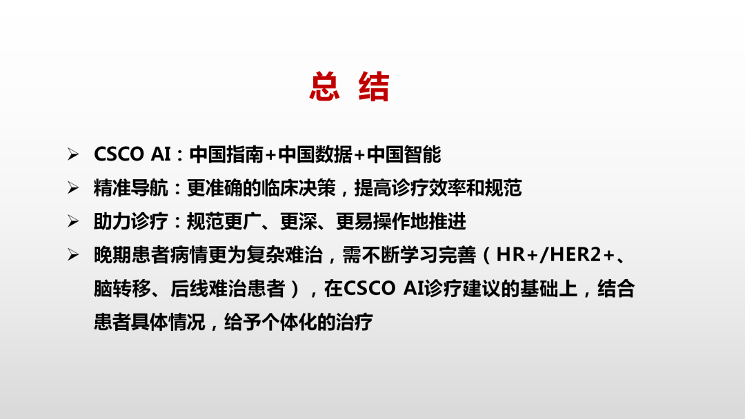 薛妍教授:晚期乳腺癌治疗策略多变,以治疗目标为例,若患者症状较重,则要快速缩瘤争取ORR,若患者肿瘤负荷比较低,需要提高生活质量、延长生存期,则达到SD就是很好的疗效了。因此,晚期乳腺癌更考验医生对CSCO AI决策的把控能力,正如江泽飞教授所言,CSCO AI不能盲从地使用,应在其指导下结合临床多因素来灵活决策。