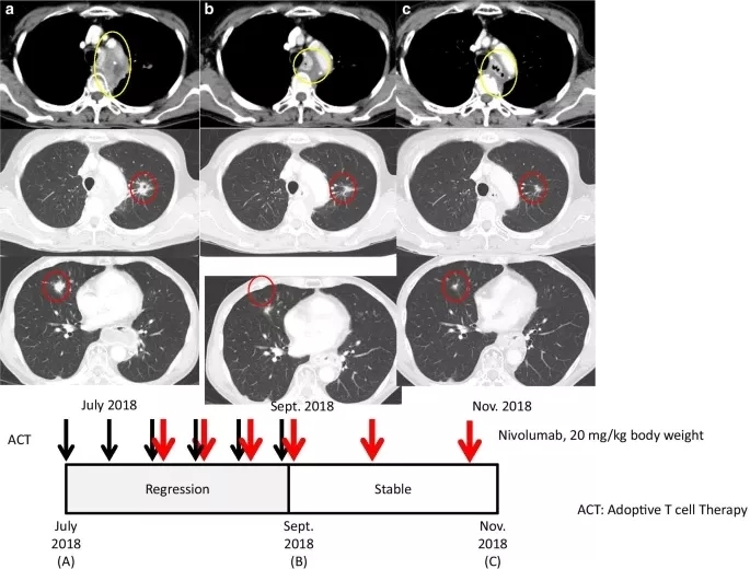 轴位CT图像对应于治疗和疾病状态的时间线。黄圈表示纵隔病变,红圈表示肺转移病灶。a.(上)使用纳武利尤单抗治疗前的状态。b. 过继细胞治疗(ACT)和免疫检查点抑制剂(ICI)联合治疗后纵隔和肺转移灶的消退。在ICI维持治疗期间,反应持续(c)。黑色和红色箭头分别表示ACT和纳武利尤单抗给药(下)。