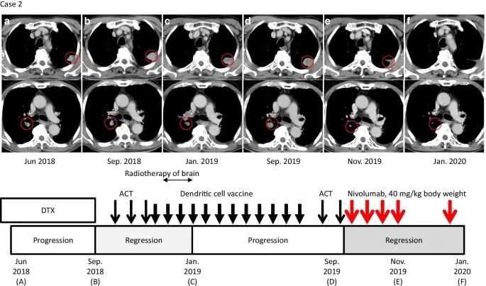 与治疗和疾病状态时间线相对应的轴位CT图像。红色圆圈表示肺和肺门转移性病变。a. (上)多西他赛(DTX)给药期间的状态。b. 过继细胞疗法(ACT)治疗前肺转移进展情况。c. ACT和树突状细胞(DC)疫苗治疗后肺转移的消退。d. 服用纳武利尤单抗前肺和肺门淋巴结转移的进展。e. 免疫检查点抑制剂(ICI)与ACT联合治疗8周后肺转移消退。在使用ICI维持治疗期间,缓解是持续的(f)。窄的黑色箭头、粗体黑色箭头和红色箭头分别表示ACT、DC疫苗和纳武利尤单抗给药(下)。