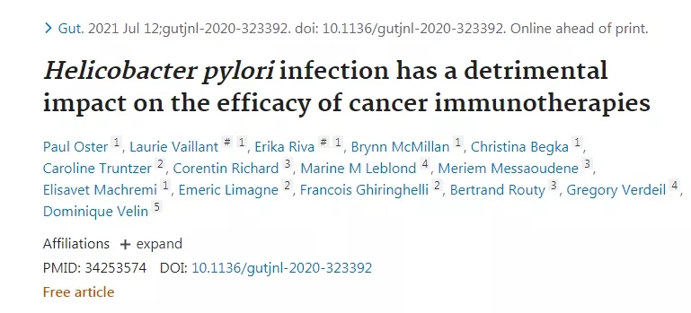Oster P, Vaillant L, Riva E, McMillan B, Begka C, Truntzer C, Richard C, Leblond MM, Messaoudene M, Machremi E, Limagne E, Ghiringhelli F, Routy B, Verdeil G, Velin D. Helicobacter pylori infection has a detrimental impact on the efficacy of cancer immunotherapies. Gut. 2021 Jul 12:gutjnl-2020-323392. doi: 10.1136/gutjnl-2020-323392. Epub ahead of print. PMID: 34253574.