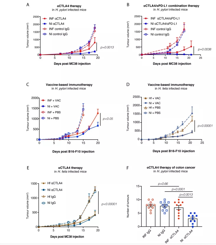 编者按:近期,瑞士洛桑大学Dominique Velin教授团队在Gut期刊上发表了一项非小细胞肺癌(NSCLC)患者的回顾性研究,发现幽门螺杆菌降低了免疫检查点抑制剂 (ICI)在小鼠中的疗效,并且与ICI的疗效较差有关。他们借助多种小鼠模型开展了一系列体内实验,发现感染幽门螺杆菌后,不管是CTLA-4和/或PD-1免疫治疗还是抗肿瘤疫苗治疗,对肿瘤的杀伤效果均变差。