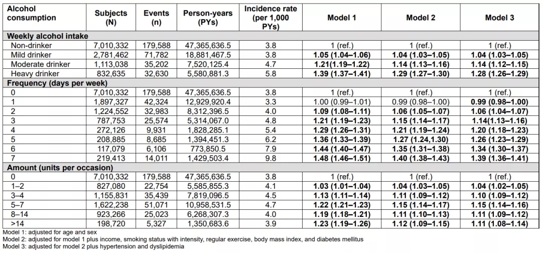 相比之下,每次饮酒5~7个单位者,胃肠道肿瘤的风险似乎增加 (aHR 1.15; 95% CI, 1.14~1.16) ,而每次饮酒更高者的aHR并不高于每次饮酒5~7个单位者(每次饮酒5~14个单位: aHR 1.11, 95%CI: 1.09~1.12; 每次饮酒高于14个单位者: aHR 1.11, 95%CI: 1.09~1.14) ( 表1) 。