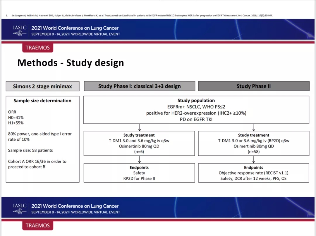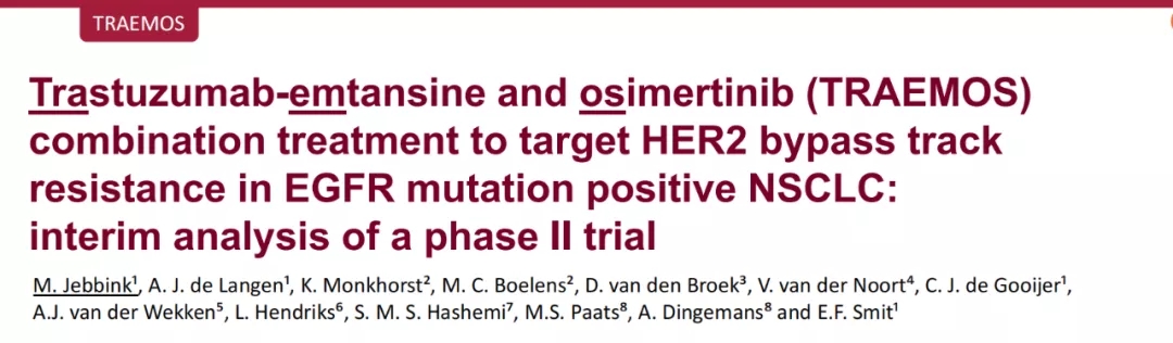 TRAEMOS研究由荷兰阿姆斯特丹癌症研究所胸部肿瘤科Merel Jebbink所主导,用于探究T-DM1联合奥希替尼用于HER-2过表达/扩增导致的EGFR敏感突变耐药患者治疗的安全性和有效性。TRAEMOS研究是基于此前一项曲妥珠单抗联合紫杉醇用于24例EGFR敏感突变且EGFR-TKI治疗后进展的HER-2阳性NSCLC患者的单臂II期研究(NCT02226757),这项研究12周时的ORR为46%,其中HER-2 IHC 3 +(67%)或HER2拷贝数≥10(100%)的患者的缓解率最高,但中位PFS“令人失望”,只有2.3个月(95%CI:0-5.8)。研究者认为,这有可能是由于未能使用EGFR-TKI阻断EGFR信号传导导致的肿瘤逃逸,以及药物在中枢神经系统中的作用有限所致。因此,研究人员假设通过TDM-1联合奥希替尼共同阻断EGFR以及HER-2通路,或可解决伴HER-2旁路激活患者的耐药问题。