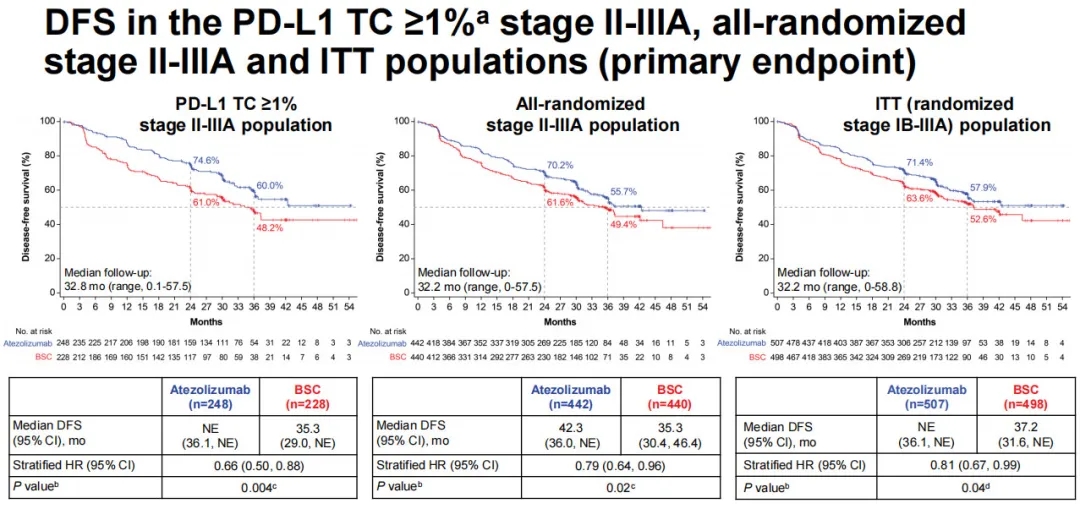 在PD-L1阳性亚组中,阿替利珠单抗尚未达到中位DFS(95% CI: 36.1-不可评估[NE]),而BSC组为35.3个月(分层HR= 0.66;95% CI: 0.50-0.88;P=0.004)。在全随机人群中,研究组和对照组的中位DFS分别为42.3个月(95% CI: 36.0-NE)和35.3个月(95% CI: 30.4-46.4)(分层 HR=0.79;95% CI: 0.64-0.96;P=0.02)。