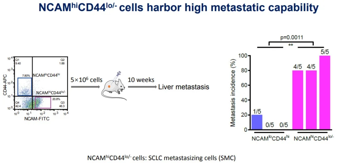 本研究采用Rb1L/L/Trp53 L/L(RP)小鼠模型,将RP模型NCAMhiCD44lo/-亚群确认为SCLC转移细胞(SMC)。此外,我们发现在SCLC恶性进展过程中,SMC是从NCAMloCD44hi细胞(非SCLC转移细胞,非SMC)逐渐转换而来。