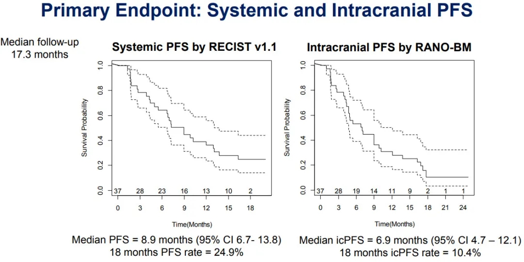 在17.3个月的中位随访中,该方案在40名患者中获得8.9个月全身PFS(95% CI: 6.7-13.8)。中位颅内PFS为6.9个月(95% CI: 4.7-12.1);全身和颅内的18个月PFS率分别为24.9%和10.4%;