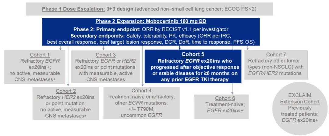 主要研究终点为采用RECIST v1.1标准研究者评估的ORR。其他疗效终点包括疾病控制率(DCR)、缓解持续时间(DoR)、PFS(由独立评审委员会IRC及研究者评估)和总生存期(OS)。患者每日口服Mobocertinb 160mg。