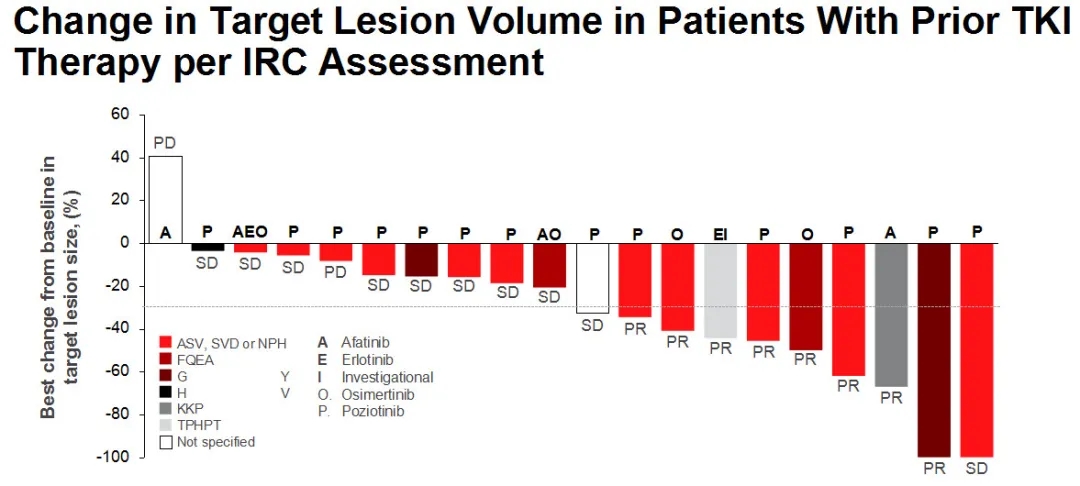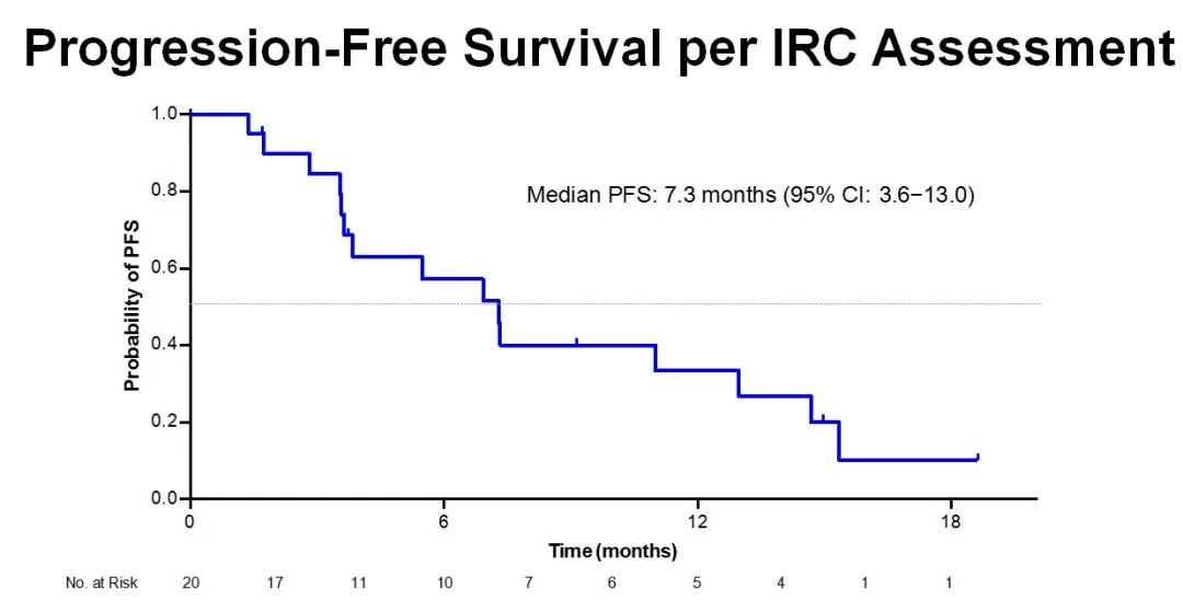 治疗疗效:研究者评估的经过验证的ORR为20%;IRC评估的验证后ORR为40%;DCR患者18例(90%);95%(19/20)的患者靶病灶减小。中位DOR时间13.0个月(5.6-13.5);中位PFS 7.3 个月(3.6-13.0);中位OS未达到 (14.7–NR)。