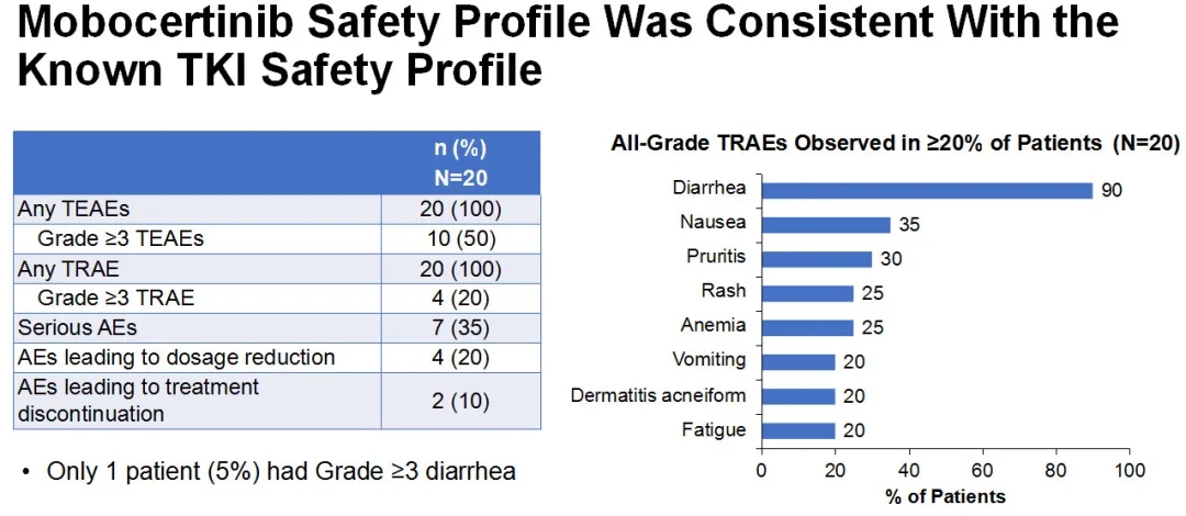 不良反应:发生率≥20%的治疗相关不良反应(TRAEs)主要为腹泻(90%)、恶心(35%)、瘙痒(30%)、皮疹(25%)、贫血(25%)、呕吐(20%)、痤疮样皮炎(20%)和疲劳(20%)。4名患者发生了3/4级治疗相关不良反应。7名患者发生了严重的不良反应(35%),仅1例患者出现了≥3级的腹泻。4例患者因AEs减量;2例患者因AEs终止治疗(10%)。