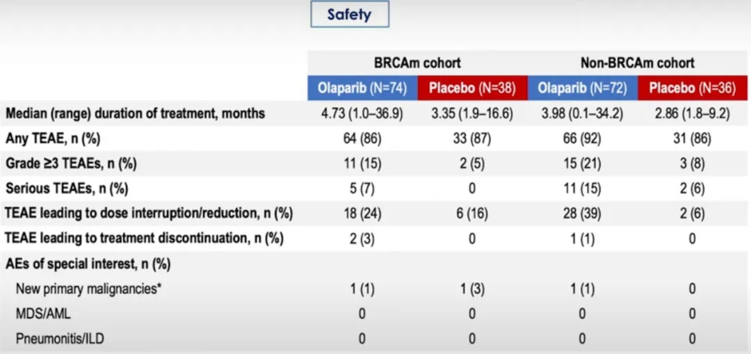 没有观察到新的安全信号。奥拉帕利组的治疗期间不良事件(TEAE)更常见,其中≥3级TEAE在BRCA1/2突变患者中占15%(安慰剂组5%),非BRCA1/2突变患者为21%(安慰剂组8%)。