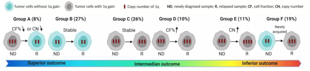 另外,我们还关注了复发后1q21扩增克隆大小和拷贝数变化的预后价值,研究发现19%患者在复发时新检测出1q21扩增,另有11%的患者在初诊/复发均有1q21扩增,且1q21的拷贝数在复发时增加(例如从3拷贝增加到4-5拷贝),这些患者的预后明显差于其他患者,本研究初次详细探索了MM复发进展时1q21扩增大小和拷贝数改变是如何影响患者生存预后。