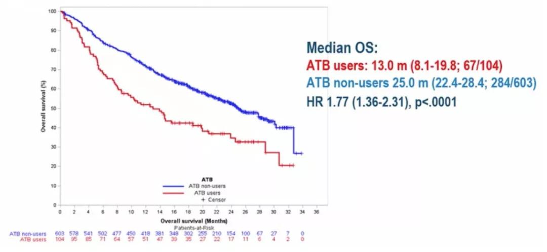 抗生素使用者中位OS为13.0个月(95%CI:8.1~19.8;67 /104),而非使用者则为25.0个月(95%CI:22.4~28.4;284 / 603)(HR 1.77,95%CI:1.36~2.31,P<0.0001)。在多变量分析中,抗生素治疗仍与更差的OS相关(HR 1.59 ,95%CI:1.22~2.09,P=0.0008)。