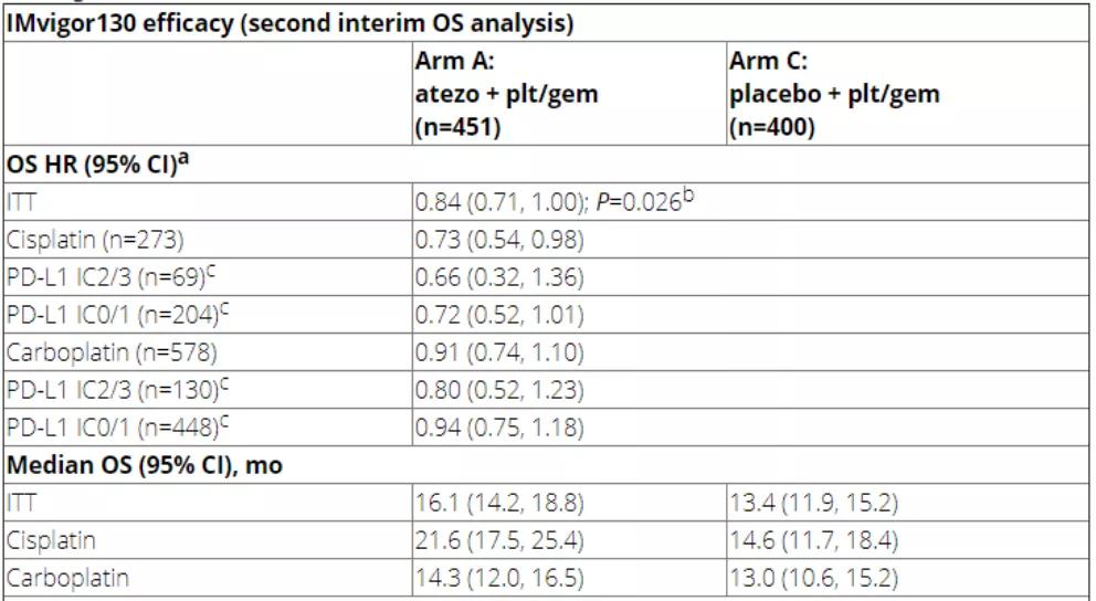 2021年AACR报道的二次中期分析结果显示,相较于单独化疗(C组),阿替利珠单抗联合化疗(A组)可在数值上改善患者OS(16.1 vs 13.4个月;HR 0.84,95%CI:0.71~1.00;P=0.026,未达统计学临界值P=0.014);单独阿替利珠单抗(B组)的改善程度则更微弱(15.2 vs 13.1个月,HR 0.99)。