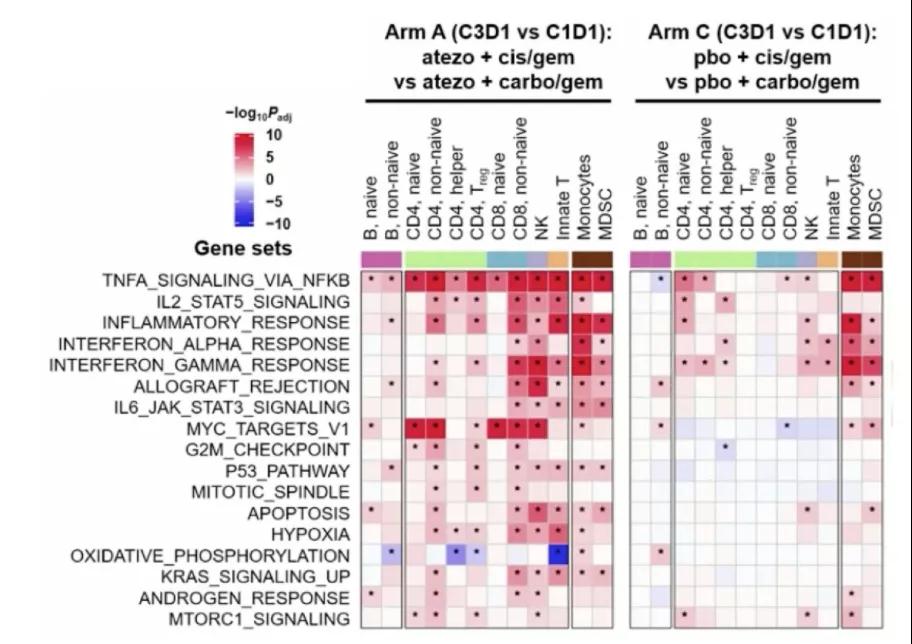 研究人员对IMvigor130研究中A组和C组70例患者,在第1周期第1天(C1D1)和第3周期第1天(C3D1)采集外周血单个核细胞(PBMC)进行单细胞RNA测序(scRNA seq),通过基因谱表达评价治疗前后顺铂(Cis)或卡铂(Carbo)诱导的肿瘤微环境(TME,n=113)变化。