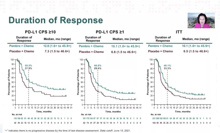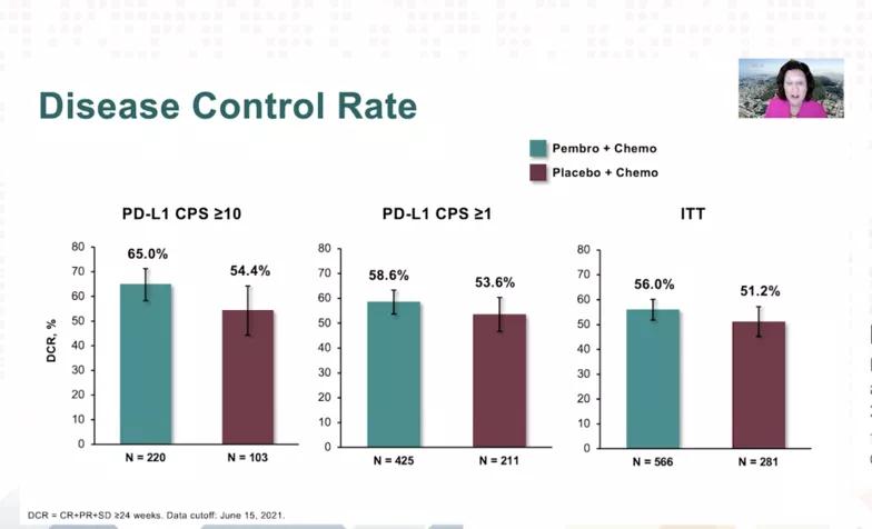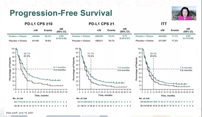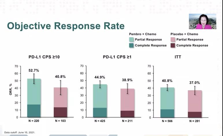 PFS结果与以往获得的显著性获益一致,pembrolizumab+化疗在CPS≥10人群中获得了ORR的改善(52.7% vs 40.8%)。(见下图)