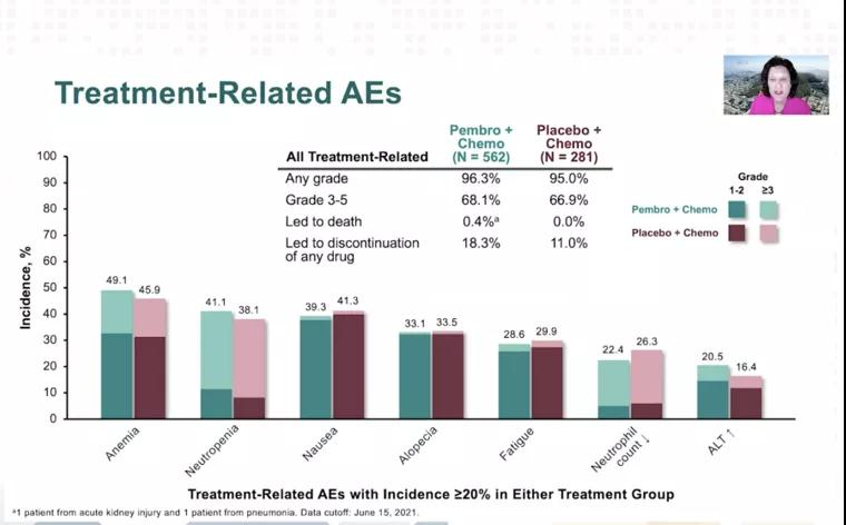 对于所有研究终点,pembrolizumab+化疗的疗效随着PD-L1的分数增大而增加。3-5级的治疗相关不良反应pembrolizumab+化疗组为68.1%(2例死亡),安慰剂+化疗组为66.9%(0例死亡)。