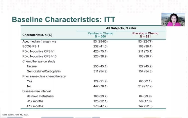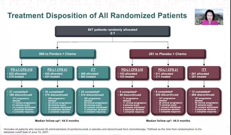 研究入组了847例未经治疗或DFI≥6个月的mTNBC患者,按2:1随机分配接受pembrolizumab+化疗(白蛋白紫杉醇、紫杉醇或吉西他滨+卡铂)或安慰剂+化疗,至多给予35周期pembrolizumab或安慰剂治疗,直至疾病进展或不可耐受的毒性。根据化疗类型(紫杉类或吉西他滨+卡铂)、PD-L1状态(CPS≥10 OR<1)和之前(新)辅助治疗化疗方案是否相同(是 vs 否)进行分层。双重主要研究终点是PD-L1阳性患者(CPS≥10和≥1)和ITT人群的PFS和OS,次要终点包括ORR等。试验过程中对不良反应进行严密监测并应用常见不良反应事件评价标准CTCAE v4.0进行分级。