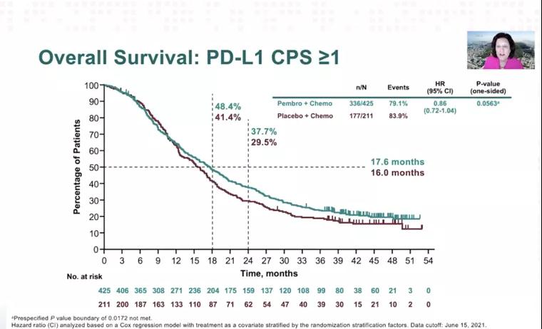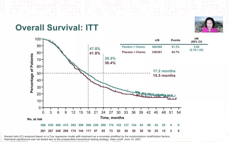 截至2021年6月15日,中位随访44.1个月,与安慰联合化疗相比,pembrolizumab联合化疗显著改善PD-L1 CPS≥10 mTNBC患者的OS(23.0m vs 16.1m,HR=0.73;95%CI:0.55~0.95)。对于CPS≥1者,pembrolizumab+化疗组和安慰剂组的OS分别为17.6m vs 16.0m,ITT人群中两组患者OS分别为17.2m vs 15.5m。