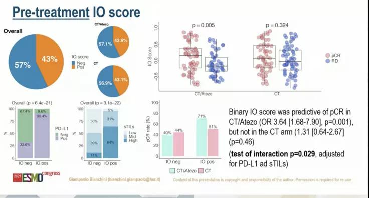 在治疗前,双IO评分可以预测CT/A中的pCR(OR=3.64,P=0.001),但在CT组中没有预测价值(OR=1.31, p=0.46,交互性P值为0.029)。