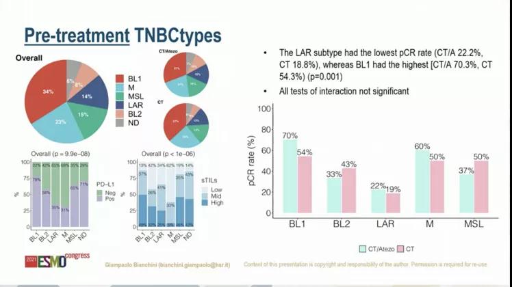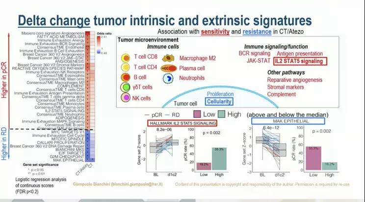 NeoTRIP研究中将TNBC患者随机分为接受8个周期的白蛋白紫杉醇+卡铂(CT)组或白蛋白紫杉醇+卡铂+Atezolizumab(CT/A)组。评估258例患者的pCR情况,242例患者(93.8%)在治疗前基线以及161例患者(62.4%)在第2疗程第1天(d1c2)进行了RNA序列分析。评价pCR率与27基因IO评分、TNBC亚型以及选择肿瘤的内生和外在基因特征。在获得pCR组,有更高反应的为在d1c2无肿瘤细胞残留者(CTA组为33.3%,CT组为16.5%)。根据基线PD-L1和sTILs进行分析的调整。