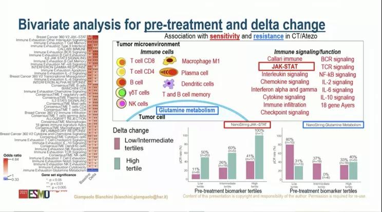 高血管生成和高脂肪酸/高胆固醇是CT/A方案耐受的独立危险因素(P=0.005),但是无关于CT方案(P=0.02)。仅在CT/A组,更高的应答者为具有更高免疫特征的人群。在d1c2,高免疫相关特征在两组具有相似的pCR预测价值,谷氨酰胺代谢与CT/A耐药相关。如,高CD8(大于平均值)者,CT/A组pCR率为58.6%,CT组为61.7%,但是低CD8者,两组pCR率则分别为22%和23.1%。生物标志物的基线和动态变化值的联合比单独分析更有价值。