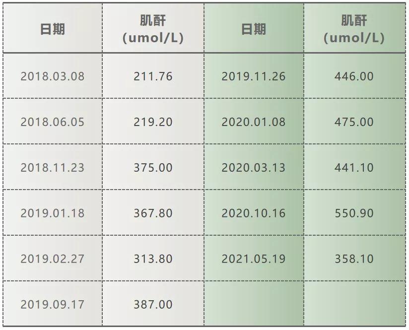 血生化:血清肌酐如下表所示,余肝肾功能等生化指标基本正常。