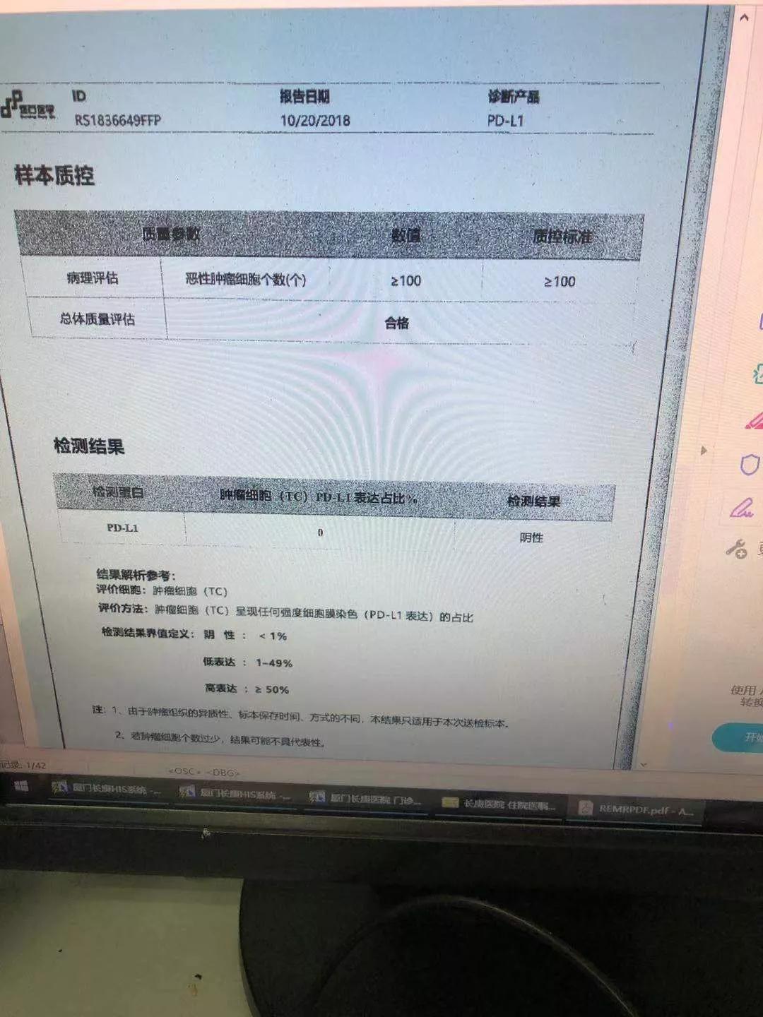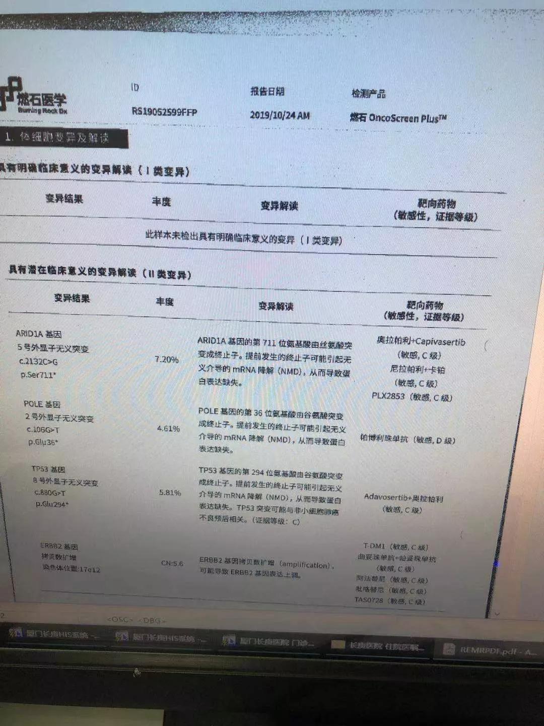2019-10检测结果:PD-L1 1%;ARID1A基因7.20%,ERBB2基因CN=5.6,POLE基因4.61%,TP53基因5.81%。