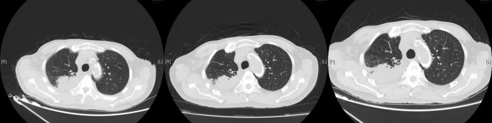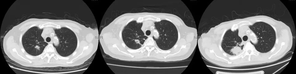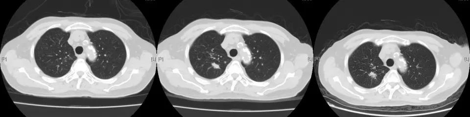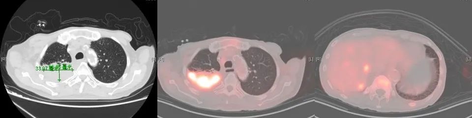 2017年7月行全身PET-CT提示右肺上叶高代谢病灶。2017年8月份行肺穿刺活检未能明确病理诊断。2017年10月份再次行全身PET-CT:右上肺结节增大,代谢增高,与家属商量后,外院予试用口服“吉非替尼”靶向治疗。
