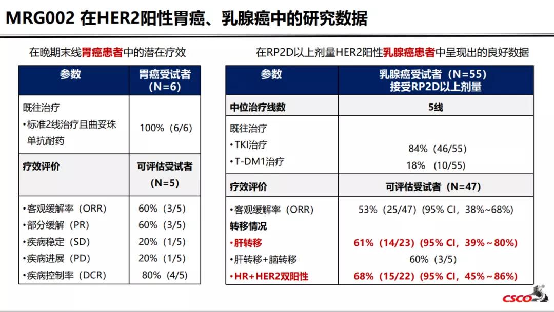 李进教授进一步分析了整个Ⅰ期研究中MRG002对HER2阳性乳腺癌和胃癌的效果。在可评估的5例既往接受2线治疗且曲妥珠耐药胃癌患者中,ORR为60%,DCR为80%。在可评估的47例RP2D以上剂量的HER2阳性乳腺癌的ORR达到53%,其中23例肝转移患者的ORR为61%,5例肝+脑转移患者ORR为60%,22例HER2和HR双阳性患者的ORR为68%。