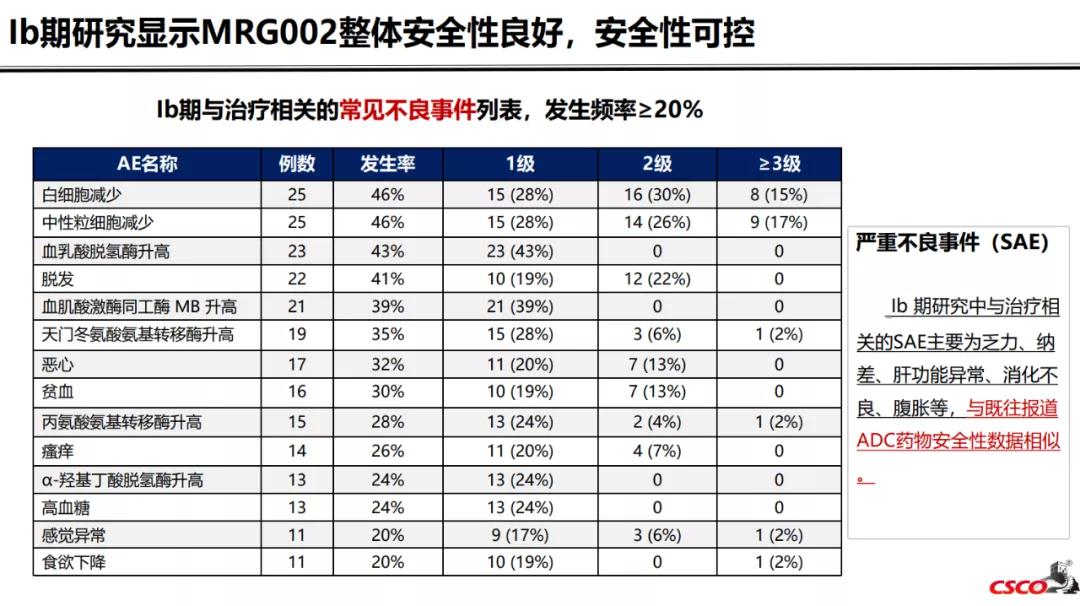 Ⅰb期研究的安全性方面,其常见不良反应为中性粒细胞计数降低(46%)、LDH升高(43%)、多为1~2级;常见(发生率≥10%)的3级不良反应仅为中性粒细胞计数降低(17%),无危及生命不良事件。基于此,李进教授评定:“MRG002的安全性非常良好,不良反应可控且在短期内可恢复正常。”
