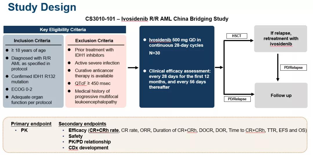 CS3010-101研究为ivosidenib国内首个桥接注册研究,ivosidenib在中国携带IDH1敏感突变的R/R AML患者观察到的药代动力学特征、安全性和有效性数据与在美国和法国进行的AG120-C-001研究人群中观察到的数据基本一致。基于在国际和国内注册临床研究中所显示出来的在携带IDH1突变R/R AML患者中良好疗效和安全性,ivosidenib以其明确的临床优势,被列入了2020版《CSCO恶性血液病诊疗指南》。