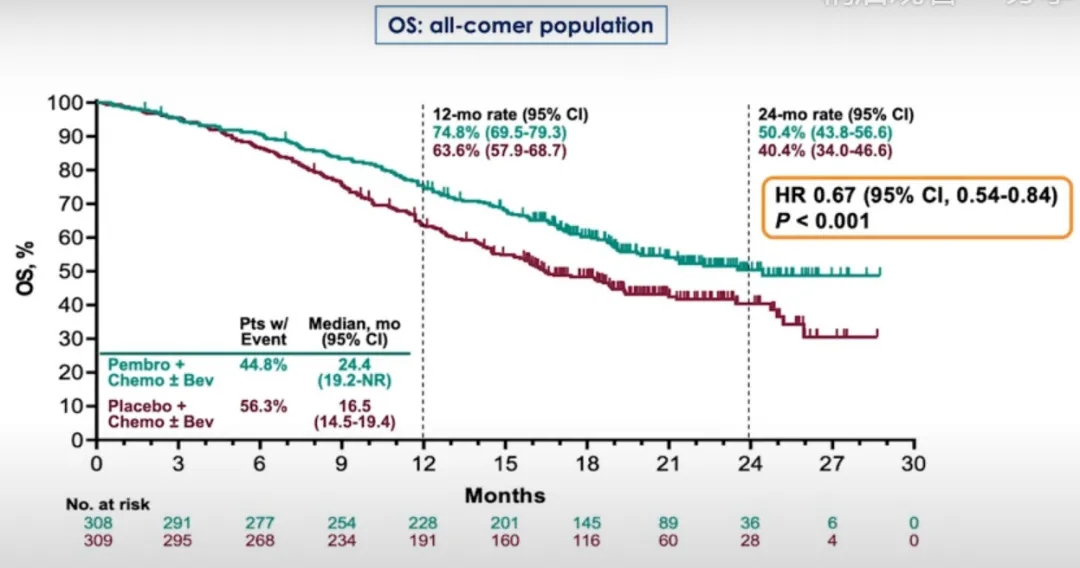 研究组的OS相比对照组提高33%,中位OS分别为24.4个月 vs 16.5个月(风险比[HR]=0.67;95%置信区间[CI]: 0.54–0.84;p<0.001) 。