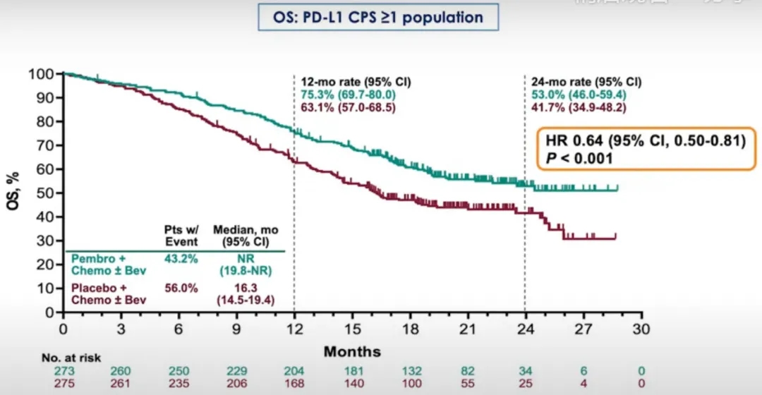 在不同的PD-L1阳性评分(CPS)患者的亚组分析中,帕博利珠单抗组对比安慰剂组,所有受试者(HR=0.67)、PD-L1 CPS≥1(HR=0.64)和PD-L1 CPS≥10(HR=0.61)患者的OS HR数值相似。