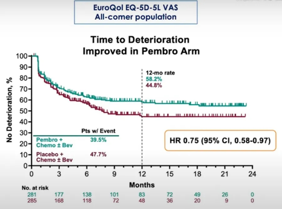 研究组的EQ-5D-5L VAS评分恶化时间得到改善,HR为0.75(95% CI: 0.58-0.97),研究组未达到EQ-5D-5L VAS恶化中位时间,而对照组为7.7个月。
