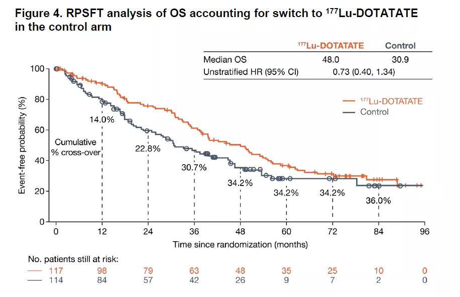 临床获益明显,但统计学上不显著,研究者们没有停下分析的脚步,诸多影响因素中,对照组的交叉影响最显著,有36.0%的患者后续选择了核素治疗,且多数(22.8%)是在两年内交叉的治疗组,考虑交叉因素的影响,NETTER-1 的研究者们将对照组的OS修正到30.9个月,由此,对照组与治疗组的OS差距进一步加大到17.1个月。