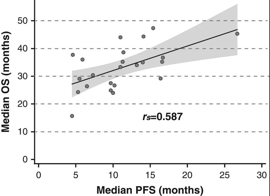 Pavel教授指出,ORR是肿瘤对治疗形态学上的响应,但并不与OS相关,相反,PFS与OS在NET的临床研究中有统计学意义的相关,r值为0.5871。因此PFS是诸多NET临床研究中的首要研究终点,而在NETTER-1中,PFS显著延长,OS获益趋势明显,但未达到统计学意义。
