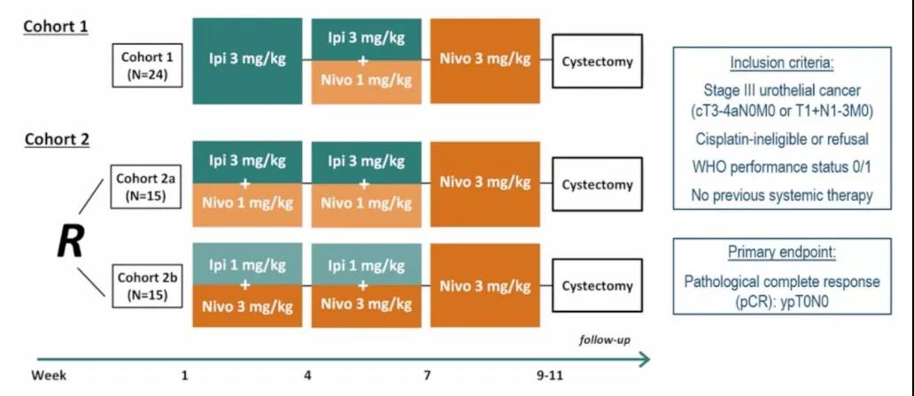 NABUCCO是一项多中心、Ib/II期、术前治疗试验。在队列2中,将30名IIl期、Cis不耐受(或拒绝)的UC患者(1:1)随机分配到A组:两个周期Ipi 3 + Nivo 1(第1天、第22天)和Nivo 1(第43天);或B组:两个周期Ipi 1 + Nivo 3(第1天,第22天)和Nivo 3(第43天)。主要终点为pCR率。次要终点包括可行性(12周内切除)和3-4级免疫相关不良事件(IRAE)。