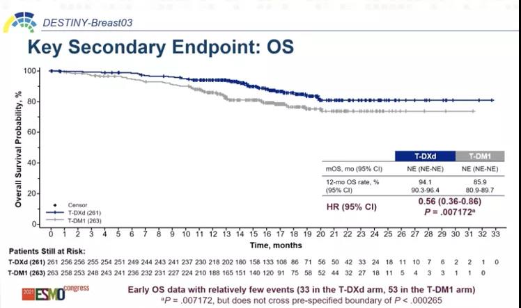 对于HER2+乳腺癌,DESTINY-Breast03研究初步结果公布:DS-8201与T-DM1在二线治疗中进行了头对头比较,中位随访分别为16个月和15个月时,DS-8201组的中位PFS仍为未达到(95% CI:18.5~NE),而T-DM1组的中位PFS为6.8个月(95% CI:5.6~8.2)。两组间PFS具有高度显著的统计学差异(P=7.8×10-22)且具有显著临床意义的改善。我们也从中看到了DS-8201治疗组患者OS获益的趋势。DS-8201真是一个神药,由研究者评估的中位PFS达到了25个月,而且这是在90%以上的二线和二线以上的人群中获得的,已经远远超过了既往一线治疗的最好中位PFS。